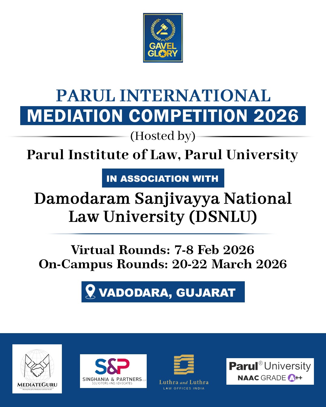Proud to partner with Parul University for the 2nd Edition of the Parul International Mediation Competition 2026, a flagship academic initiative hosted by the Parul Institute of Law, Parul University, Vadodara, Gujarat in association with Damodaram Sanjivayya National Law University (DSNLU).